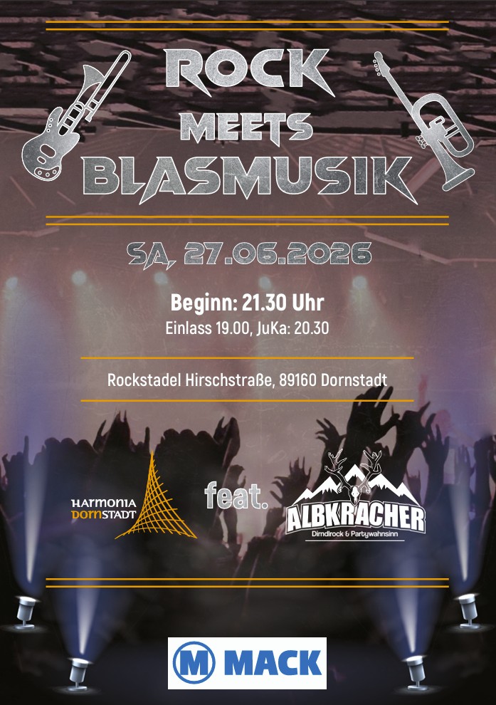 Am 27. Juni 2026 veranstaltet die Musikkapelle Harmonia Dornstadt e.V. ein außergewöhnliches musikalisches Crossover, bei dem die Energie der Rockmusik auf die Klangfülle der Blasmusik trifft. Gemeinsam mit der bekannten Coverband „Albkracher“ und über 80 Blasmusiker – darunter rund 40 Gastmusikerinnen und -musiker aus umliegenden Musikvereinen – entsteht ein einzigartiges Konzert, das weit über Dornstadt hinausstrahlen wird.